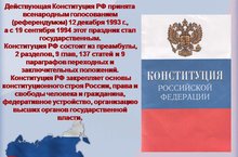 День Конституции - празднование принятия Конституции в современной России, отмечается 12 декабря.12 декабря 1993 всенародным голосованием была принята Конституция Российской Федерации, а с 1994 года указами президента России («О Дне Конституции Российской Федерации» и «О нерабочем дне 12 декабря») день 12 декабря был объявлен государственным праздником. В СССР до 1977 отмечался 5 декабря, в день принятия Конституции СССР 1936 года. Затем праздник был перенесён на 7 октября (день принятия новой конституции СССР - «Конституции развитого социализма»). Традиция празднования Дня Конституции была продолжена и в современной России.24 декабря 2004 года Госдума приняла поправки в Трудовой кодекс РФ, изменяющие праздничный календарь России. С 2005 года 12 декабря более не является в России выходным днём, а День Конституции 12 декабря причислен к памятным датам России.12 декабря 1993 года в нашей стране впервые за её историю был принят принципиально новый Основной закон - такой Закон, который признал высшей ценностью человека, его права и свободы, который установил основы демократического порядка России и обязавший государство на деле соблюдать и защищать эти новые базовые ценности.