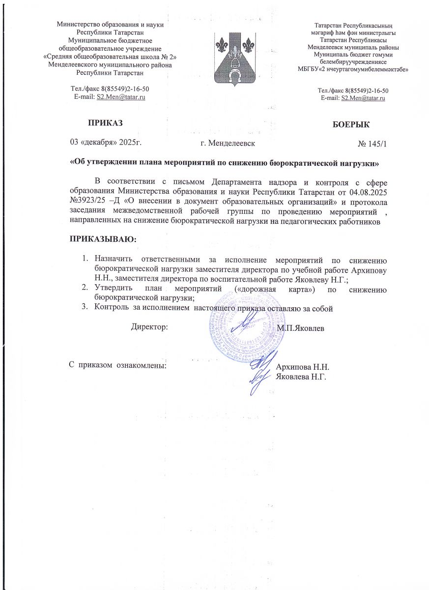 Приказ МБОУ " СОШ№2" ММР РТ "О утверждении плана мероприятии о снижении бюрократической нагрузки "