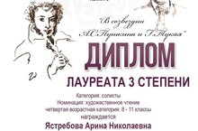 В целях воспитания у обучающихся духовной нравственности, формирования гуманистического мировоззрения, национального самосознания, гражданской позиции, чувства патриотизма, любви и уважения к литературе и ценностям отечественной культуры МБУДО «Городской центр творческого развития и гуманитарного образования для одаренных детей» г. Казани организовал VII республиканский творческий конкурс «В созвездии А. С. Пушкина и Г. Тукая», среди воспитанников дошкольных образовательных учреждений с 3-х лет, обучающихся 1-11 классов образовательных организаций г. Казани и Республики Татарстан. Ученица 9 класса «Б» нашей школы Ястребова Арина (руководитель Орлова А.В.) приняла в нем участие и завоевала Диплом Лауреата 3 степени!