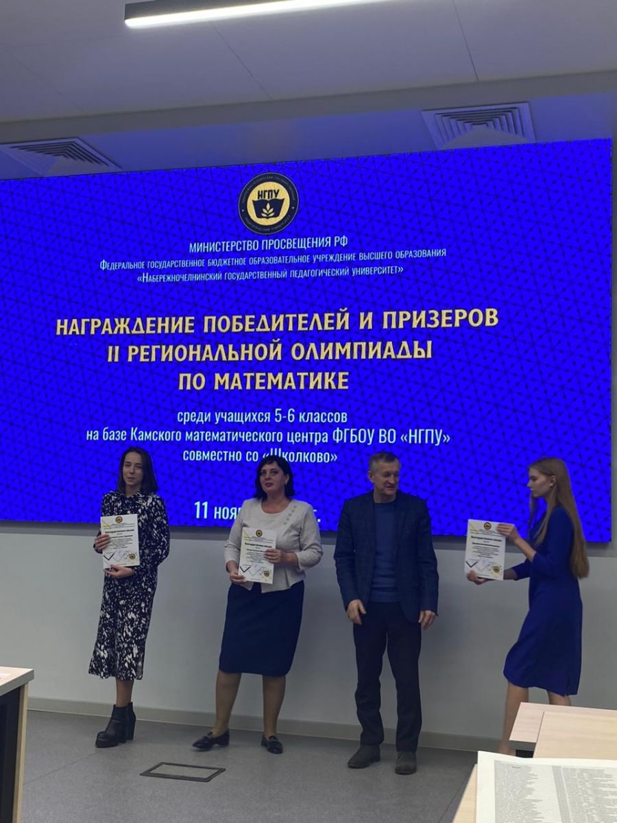 Бүген НДПУда Кама математика үзәгенең математика буенча II региональ олимпиадасында җиңүчеләрне бүләкләү тантанасы булды. Кама математика үзәге "Школково" белән берлектә 26 октябрьдә математика буенча олимпиада үткәрде. Масштаблы интеллектуаль ярышта 5-6 сыйныфларда белем алучы 450 укучы катнашты. Җиңүчеләр һәм призерлар арасында безнең мәктәп укучылары: Буланова Валерия (5Б класс), Петрова Анастасия (5Б класс), Загретдинов Марсель (5В класс) бар иде, укытучы: Гончар Светлана Николаевна