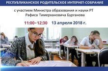Очередное республиканское родительское Интернет - собрание состоится в пятницу 13 апреля 2018г. в 11.00 ч. Собрание на самую животрепещущую тему как подготовить ребенка к ЕГЭ проведет лично глава МОиН РТ Бурганов Р.Т.