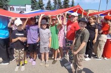 12.06.2025 г. Отдыхающие дети в пришкольном лагере "Юнга" приняли участи в шествии с Флагом России, исполнили гимн России возле администрации города