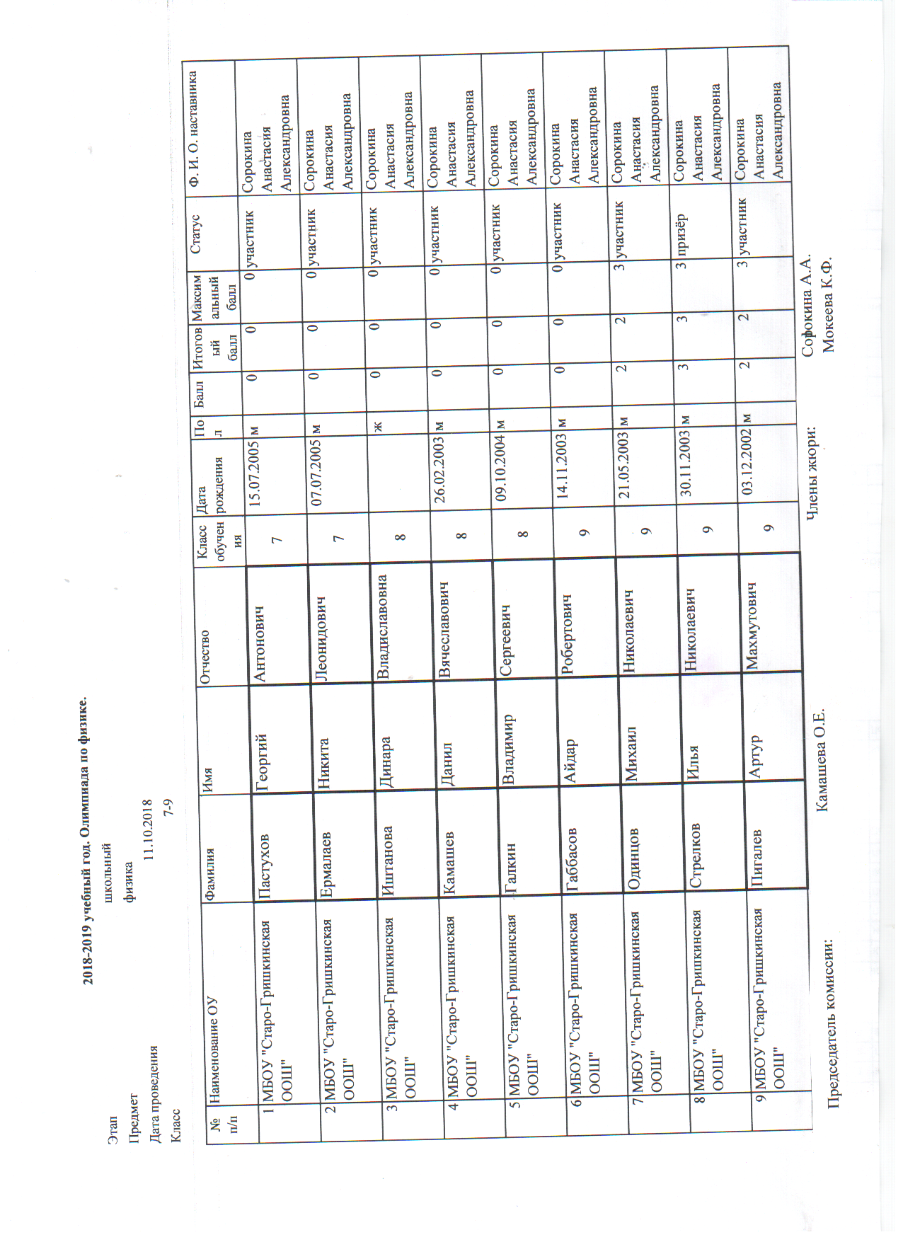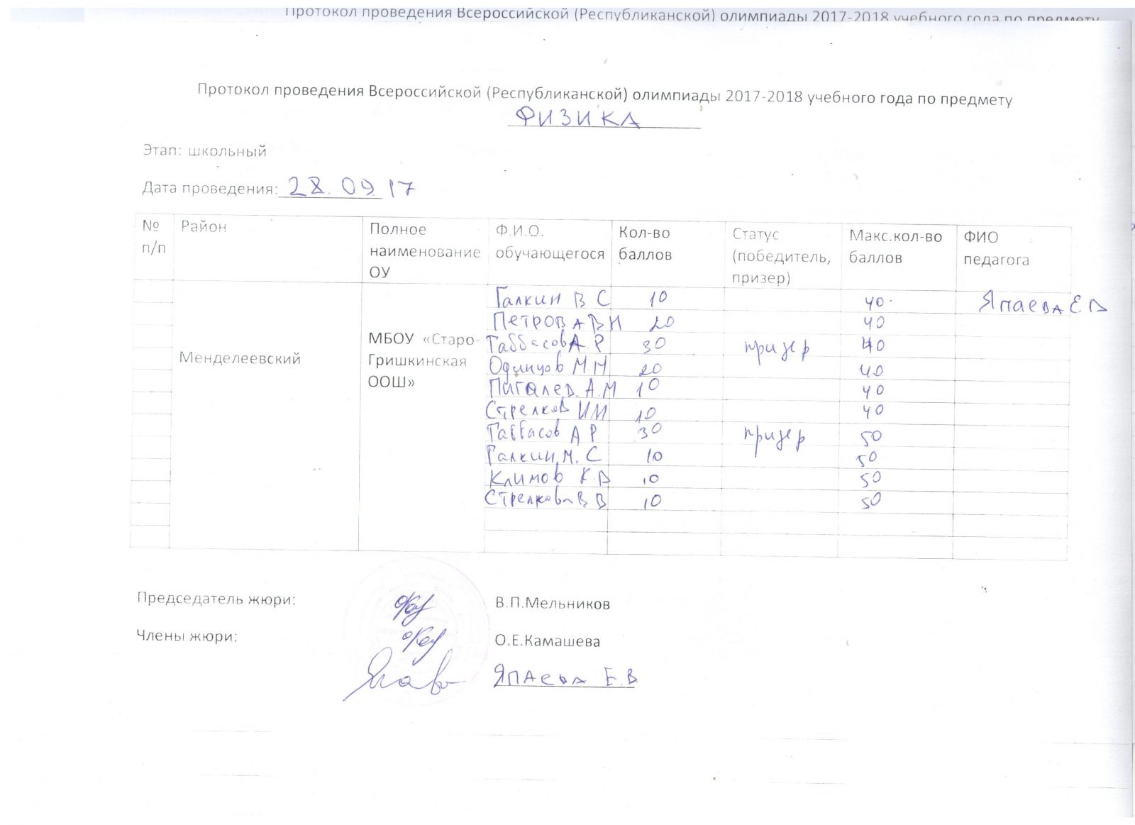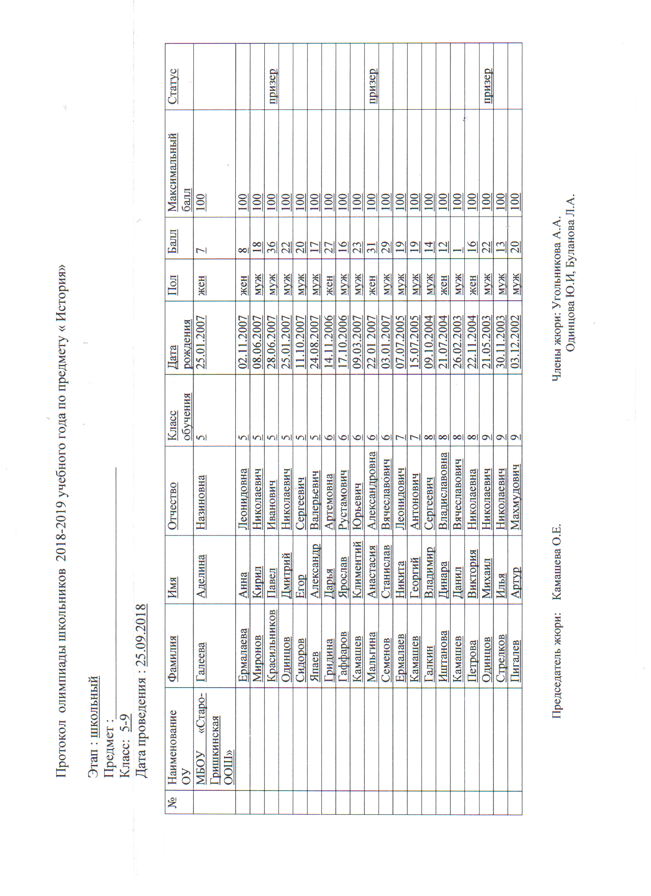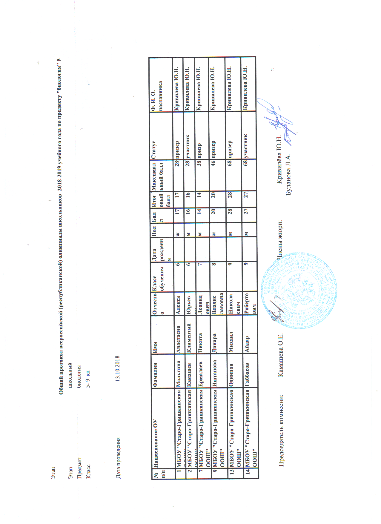 Протоколы: История, Русский язык, Физика, Математика, География, Биология, Геология, История Татарстана, Искусство (МХК), ОБЖ, Право, Технология, Обществознание, Физика, Химия, Русская литература (НШ), Русский язык (НШ), Татарская литература (ТШ), Татарский язык (ТШ), Физическая культура