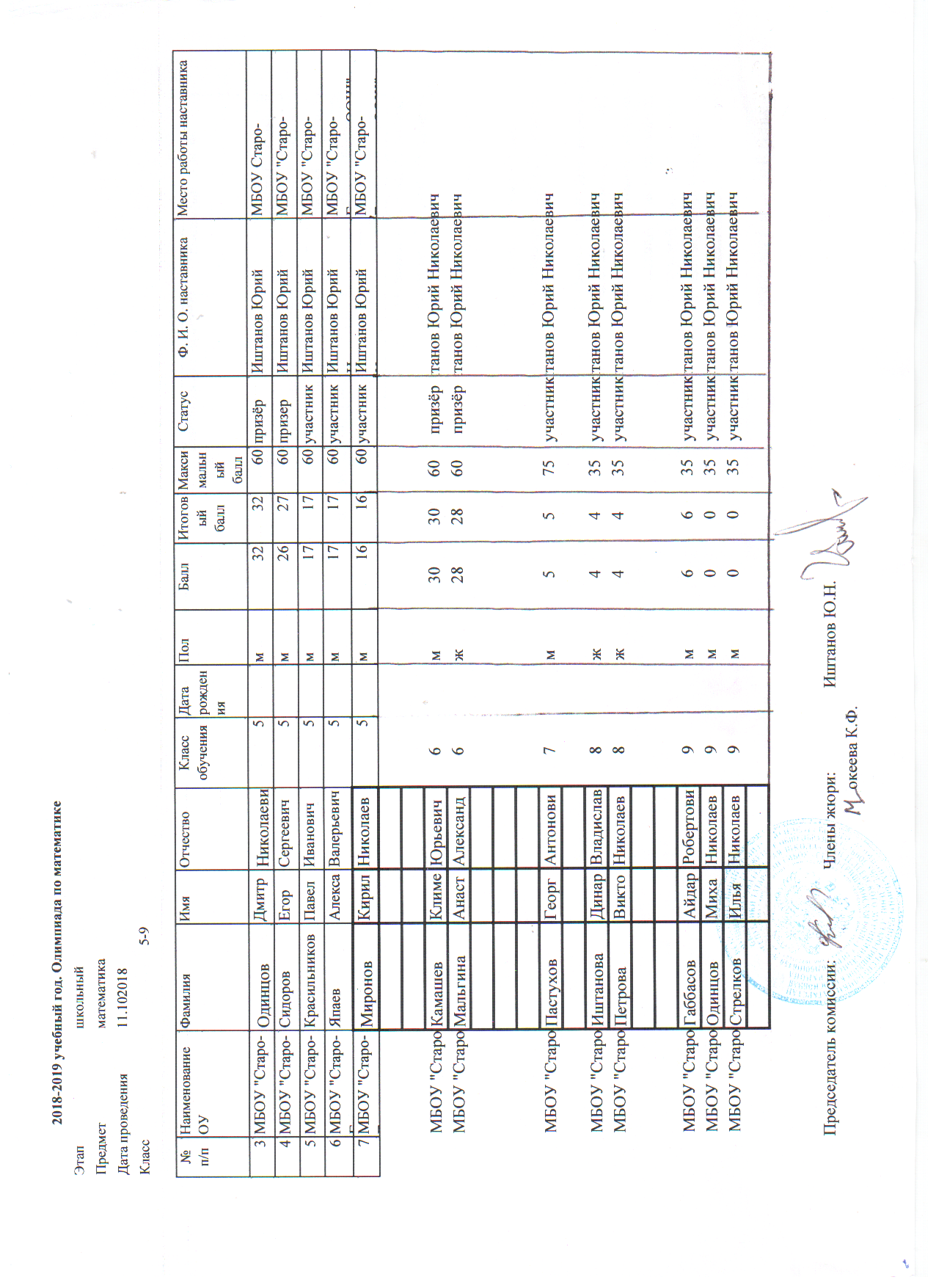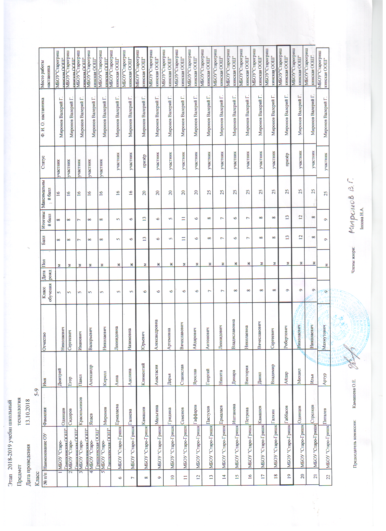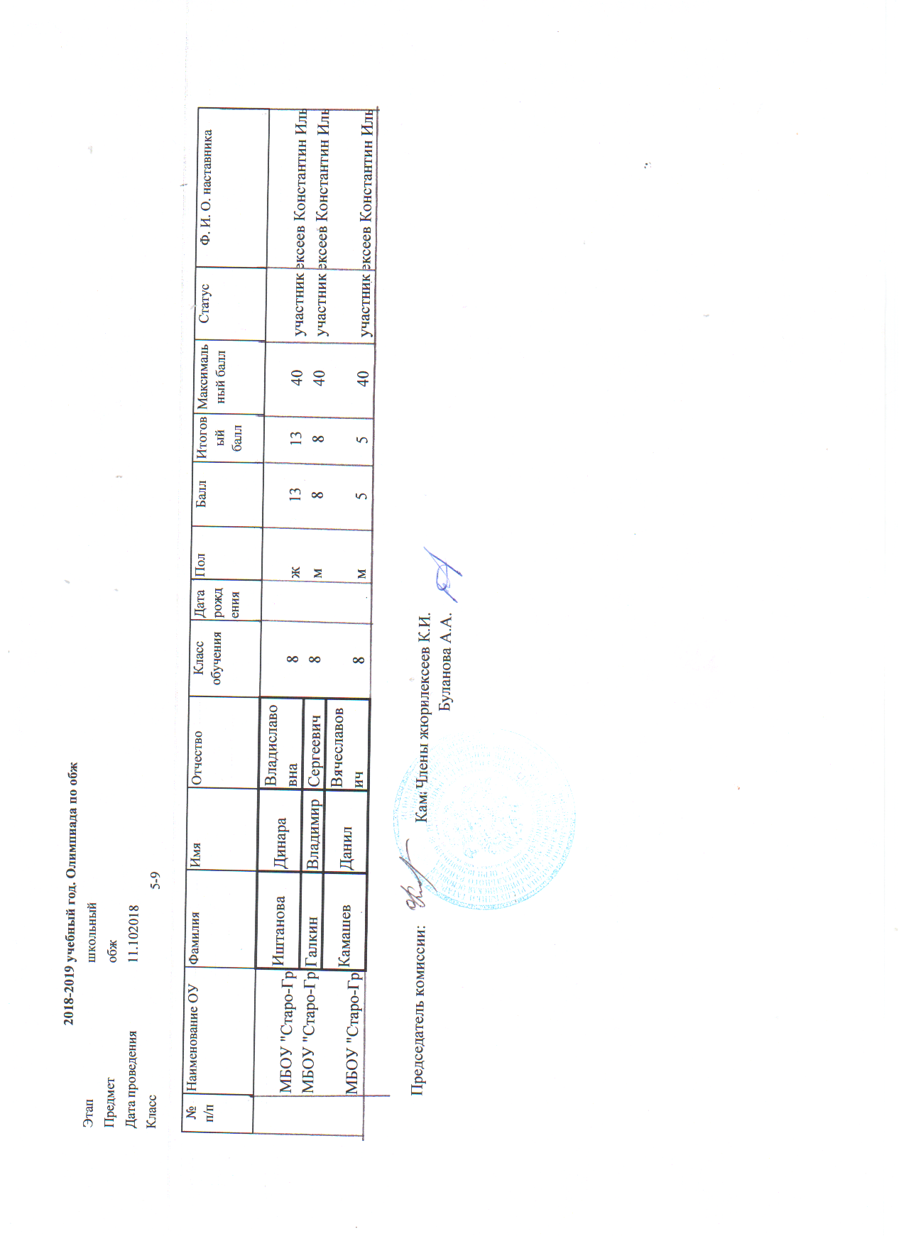 Протоколы: История, Русский язык, Физика, Математика, География, Биология, Геология, История Татарстана, Искусство (МХК), ОБЖ, Право, Технология, Обществознание, Физика, Химия, Русская литература (НШ), Русский язык (НШ), Татарская литература (ТШ), Татарский язык (ТШ), Физическая культура