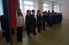 Понедельник в МБОУ " Тат.Челнинская ООШ" начался традиционно с поднятия флага и исполнения гимна Российской федерации .