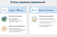 Беренче этап 2023 елның 1 апреленнән 30 июньгә кадәр. Бу этапта беркетелгән территориядә (мәктәп урнашкан районда) яшәүче балалар, шулай ук мәктәпкә керү өчен өстенлекле/беренче чираттагы хокукка ия булган ташламалы балалар гариза бирә. Прописка буенча балалар өчен документлар кабул итү 2023 елның 30 июнендә тәмамлана.