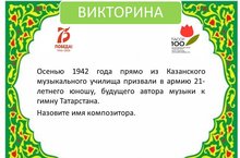 Друзья! В канун замечательных событий – 75-летия Великой Победы и 100- летия образования ТАССР наша школа искусств проводит онлайн-викторину по истории татарской музыки. Ждем вашего активного участия!