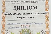 Фольклорный ансамбль «Умырзая» под руководством учителя татарского языка Исрафиловой Ф.В. получили диплом в номинации «Приз зрительских симпатий». Поздравляем ребят!27 ноябрь көнне Балалар сәнгать мәктәбе базасында "Туган телләр һәм Халык бердәмлеге елы" кысаларында Татарстан халыкларының "Ничек данлы син, туган тел" фестивале узды. Татар теле укытучысы Исрафилова Ф.в. җитәкчелегендә «Умырзая» фольклор ансамбле «Тамашачылар симпатиясе призы» номинациясендә диплом алды. Аларны котлыйбыз!