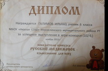 Победитель конкурса "Русский медвежонок" ученик 6 класса Галимов Ильназ награждается дипломом. ПОЗДРАВЛЯЕМ!!!