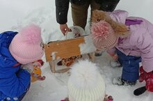 Мы развесили на кустах рябины кормушки для зимующих птиц . В нашем Аюском детском саду "Милэшкэй" мы каждое утро кладем корм в кормушки . Наших зимующих птиц не пугают морозы, а вот голод — их злейший враг. У них нет ни теплых платьев, ни дома! Они спят на открытом воздухе как в сильный шторм, так и в мороз. Поэтому мы должны защитить наших пернатых друзей