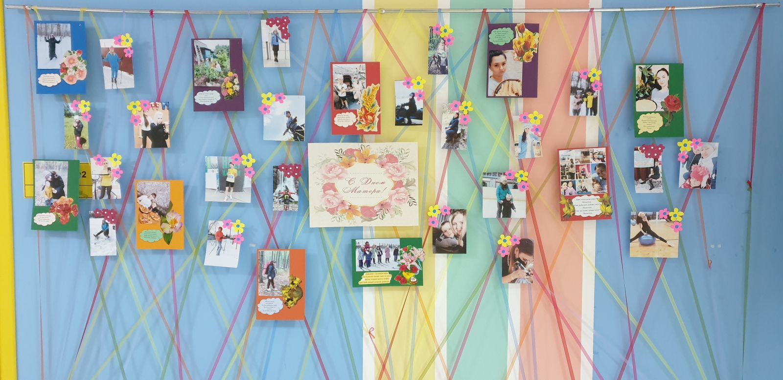 В холле детского сада организована выставка фотографий ко Дню матери под названием "Моя разносторонняя мама"