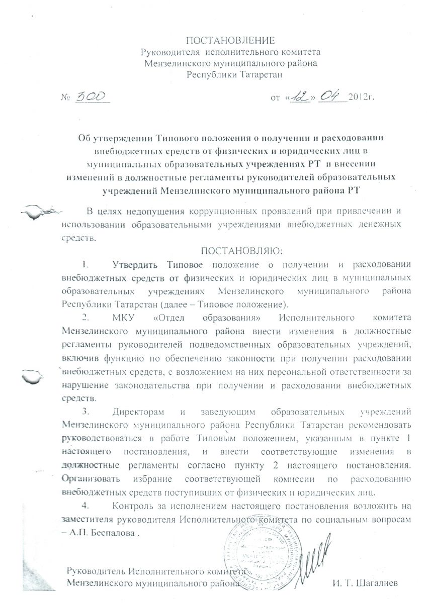 Постановление Руководителя исполнительного комитета Мензелинского муниципального района РТ от 12 апреля 2012 года № 300 >>>