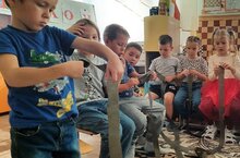 Сотрудники и воспитанники детского сада нарезают ленты и делают заготовки для маск.сетей. Далее эти заготовки передаются волонтерам, которые плетут сети и отправляют их с гуманитарной помощью в зону СВО.