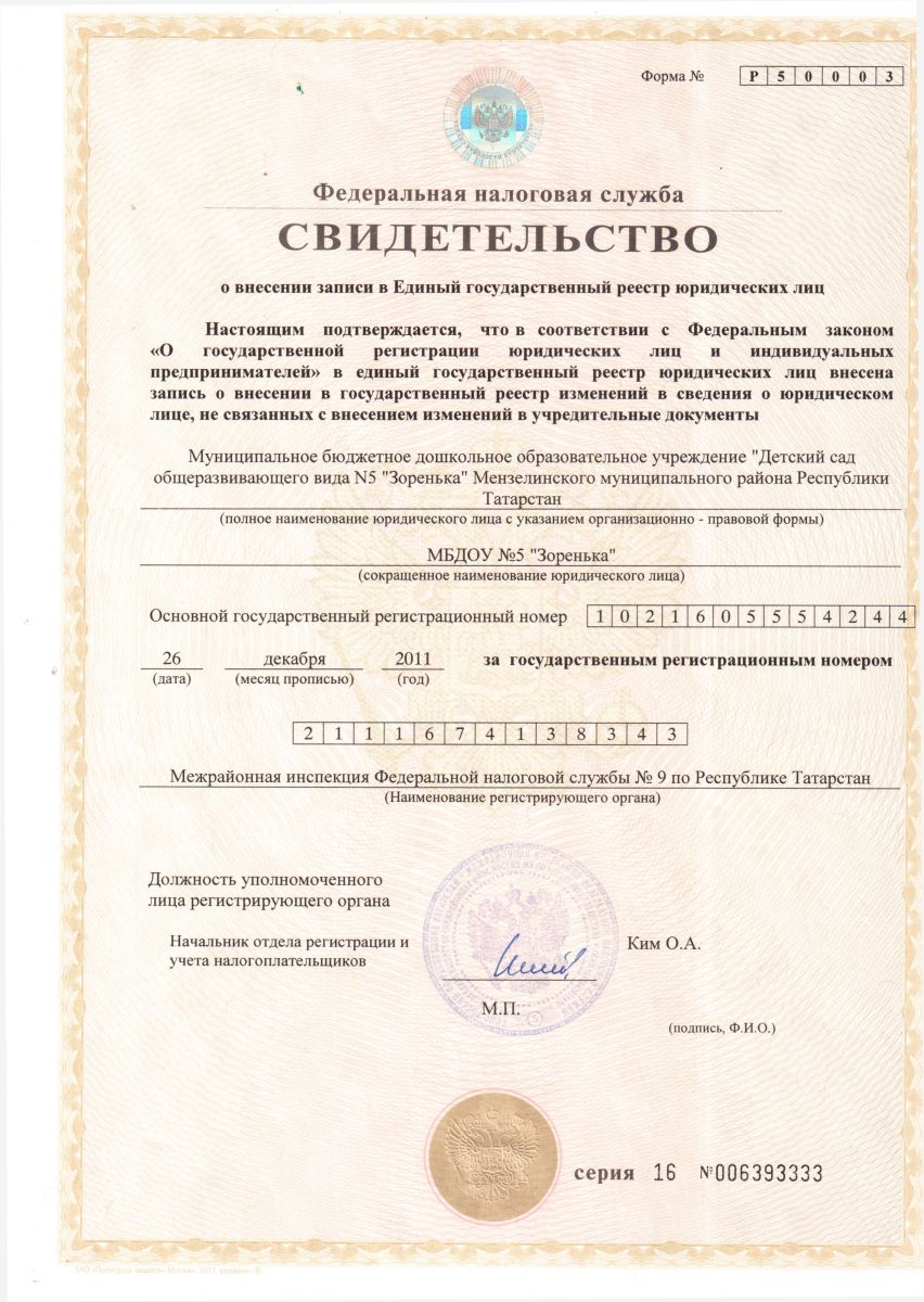 Свидетельство о внесении записи в Единый государственный реестр юридических лиц