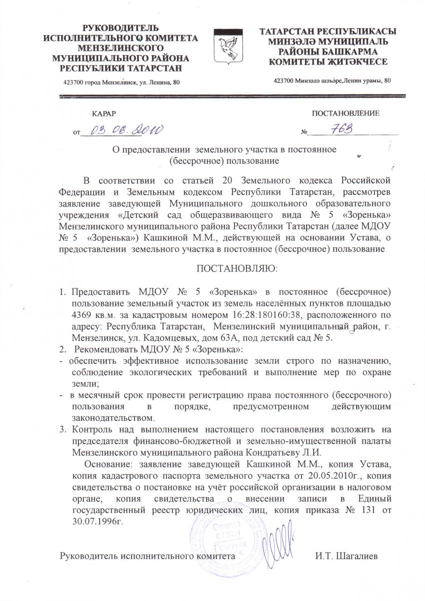 Постановление о предоставлении земельного участка в постоянное (бессрочное) пользование