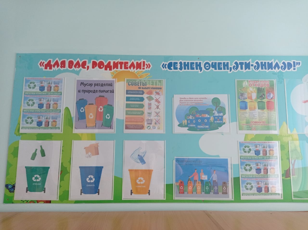 «На стенде «Для вас, родители» предлагается информационный материал по раздельному сбору мусора».