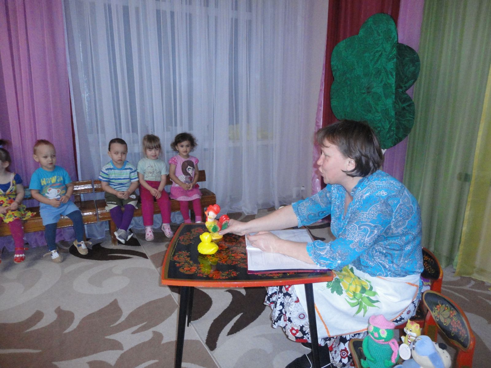 Воспитатель младшей группы Гатина М.В. провела с детьми развлечение. Дети играли в подвижные игры, инсценировали потешки. Воспитатель показала настольный театр "Мама утка и утенок Кряк"