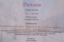 Әзерлек төркеме тәрбияләнүчеләре: Батыршина Ева, Сираева Дина, Галимова Ясмина,Корбангалина Мария, Бубекова Алена (җитәкчесе Чебашева о.В.) "күңел музыкасы" Vistaplius халыкара вокал конкурсында "Эстрада җыры" номинациясендә "I am so happy"эше буенча 2 урынны алдылар.