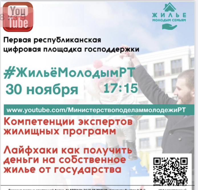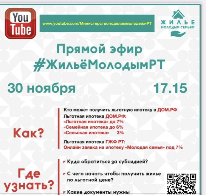 Во исполнение поручения Премьер-министра Республики Татарстан А.В.Песошина от 18.09.2021 №55023-АП, в целях повышения эффективности информирования молодых специалистов о действующих в Республике Татарстан мерах государственной поддержки молодежи в улучшении жилищных условий Министерством 30 ноября 2021 года проводится прямой эфир #ЖильёМолодымРТ. В программе прямого эфира (на площадках zoom, YouTube) в доступной и подробной форме будут представлены жилищные проекты АО «ДОМ.РФ» («Льготная ипотека» до 7% на новостройки, «Семейная ипотека» до 6% на покупку и рефинансирование, «Сельская ипотека» по ставке до 3%), а также перспективы реализации цифровизации и упрощения процедуры постановки на учет для улучшения жилищных условий для молодых семей на льготных условиях ипотеки ГЖФ Республики Татарстан.