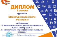 Виктория, ты — Победитель! И это не просто звание — это доказательство твоего таланта и трудолюбия. Пусть эта награда станет отправной точкой для покорения новых вершин, а уверенность в своих силах поможет достигать любых целей! ???? ???? ????Петрова Викторияне «яшь МАСТЕР»VI төбәкара балалар чемпионатында җиңүе белән котлыйбыз Компетенциясе « " декаратив-гамәли сәнгать» Остазы: Мөхәммәдиева Анастасия Евгеньевна. Виктория Чемпионатның барлык этапларында да 1 урынны яулады‼️ Виктория, Син — җиңүче! Һәм бу исем генә түгел, бу синең талантың һәм хезмәт сөючәнлегеңнең дәлиле. Бу бүләк Яңа түбәләрне яулау өчен башлангыч нокта булсын, ә үз көчеңә ышаныч теләсә нинди максатка ирешергә ярдәм итсен! ???? ???? ????