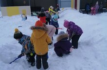 Старшая группа МБДОУ №8 "Солнышко" проводит время на прогулке с пользой: не только играют, но и помогают убирать с тропинки снег