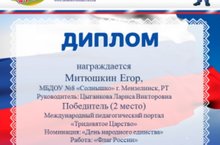 Поздравляем Митюшкина Егора , призера (2 место) конкурса рисунков , посвященному праздования "День народного единства"