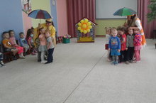 Сегодня для ребят младших групп было проведено развлечение "В гости к солнышку". Ребята отправились в гости на паровозике. В пути они встретили лису, поиграли с ней, затем помогли белке украсить поляну цветами. И наконец, дошли до солнышка. Дети с удовольствием поиграли с Солнышком в игры "Солнышко и дождик", "Птички в гнездышках". Дети были в восторге от развлечения.