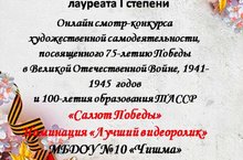 В Мензелинском районе прошел онлайн-конкурс художественной самодеятельности "Салют Победы", посвященный 75-летию Победы в Великой Отечественной войне 1941-1945 годов и 100-летию образования ТАССР. По результатам конкурса МБДОУ № 10 "Чишма" стал лауреатом I СТЕПЕНИ в номинации "Лучший видеоролик".