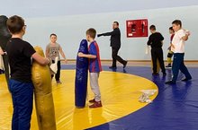 В гимназии во время каникул был проведен кружок по борьбе. Дети после разминки выполнили отработку бросков манекеном и провели контрольные схватки.