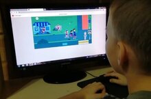 Учащиеся программируют робота, который ездит внутри круга, не выходя за его пределы на уроке дополнительного образования «Robo club».