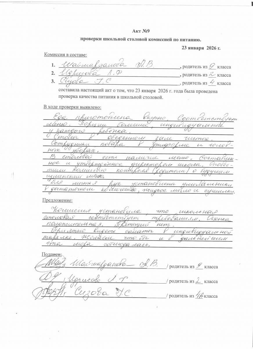 Акт №9 проверки школьной столовой комиссией по питанию