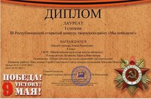 Ученица 8 кл Шахабутдинова Элина (учитель Белякова Л.Н.) приняла участие в lll Республиканском открытом конкурсе творческих работ " Мы победим!" в номинации "Наши земляки на полях сражений" и награждена дипломом 1 степени.