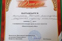 16 апреля в гимназии г. Мензелинска прошёл муниципальный конкурс среди молодых педагогов "Педагогический дебют". В конкурсе приняли участие 7 педагогов школ и детских садов. Наш молодой учитель Батыршина Татьяна Александровна приняла участие и заняла 3 место.
