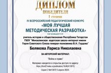 Тарих һәм җәмгыять белеме укытучысы Белякова Л. Н. "минем иң яхшы методик эшләнмә" номинациясендә 21 нче гасыр Мәгариф һәм фән эшчәнлеге фонды оештырган lV Бөтенроссия педагогик конкурсында катнашты.