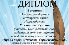 На основании приказа МКУ «Отдел образования» Мензелинского муниципального района РТ № 33 от 03 февраля 2021 года был проведен муниципальный конкурс начинающих поэтов и писателей «Проба пера» - «Иҗатка тәүге адымнар» (татарском, русском, марийском) языках, приуроченного к Году родных языков и народного единства. В конкурсе приняли участие 63 учащихся, 10 учителей из 9 школ и 7 воспитателей из ДОУ Мензелинского района. Из нашей школы учитель татарского языка и литературы Г.Г.Хамматова приняла участие и награждена дипломом I степени в номинации «Проза».