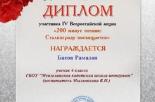 Ученики 4 класс Басов Рамазан и Ситников Роман (воспитатель Мыльникова В.П.) приняли участие в Всероссийской акции «200 минут чтения: Сталинграду посвящается»