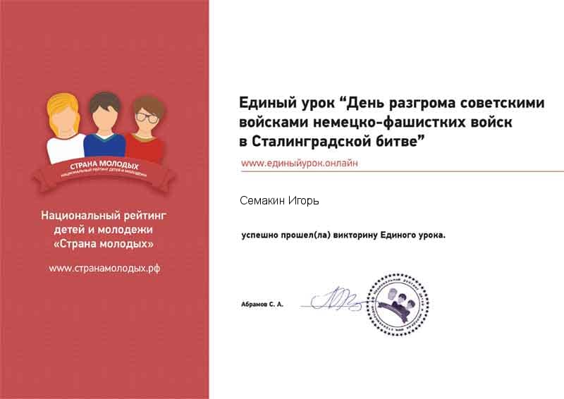 2 февраля 2021 года учащиеся 5 – 11 классов прошли онлайн-викторину Единого урока «День разгрома советскими войсками немецко-фашистских войск в Сталинградской битве» (учителя истории, обществознания Белякова Л.Н., Анастасьева О.М.) -