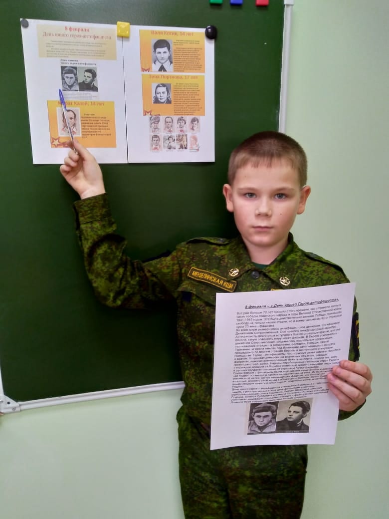 Пятнадцатилетнего Даниэля Фери убили 8 февраля 1962 года, во время антифашистской демонстрации учащихся в Париже. А Фадыл Джамаль погиб ровно через год от пыток в иракской тюрьме. Также 8 февраля 1943 года в Краснодоне были расстреляны фашистами молодогвардейцы. Учащиеся 4 класса (воспитатель Мыльникова В.П.) подготовили сообщения, которые были зачитаны.