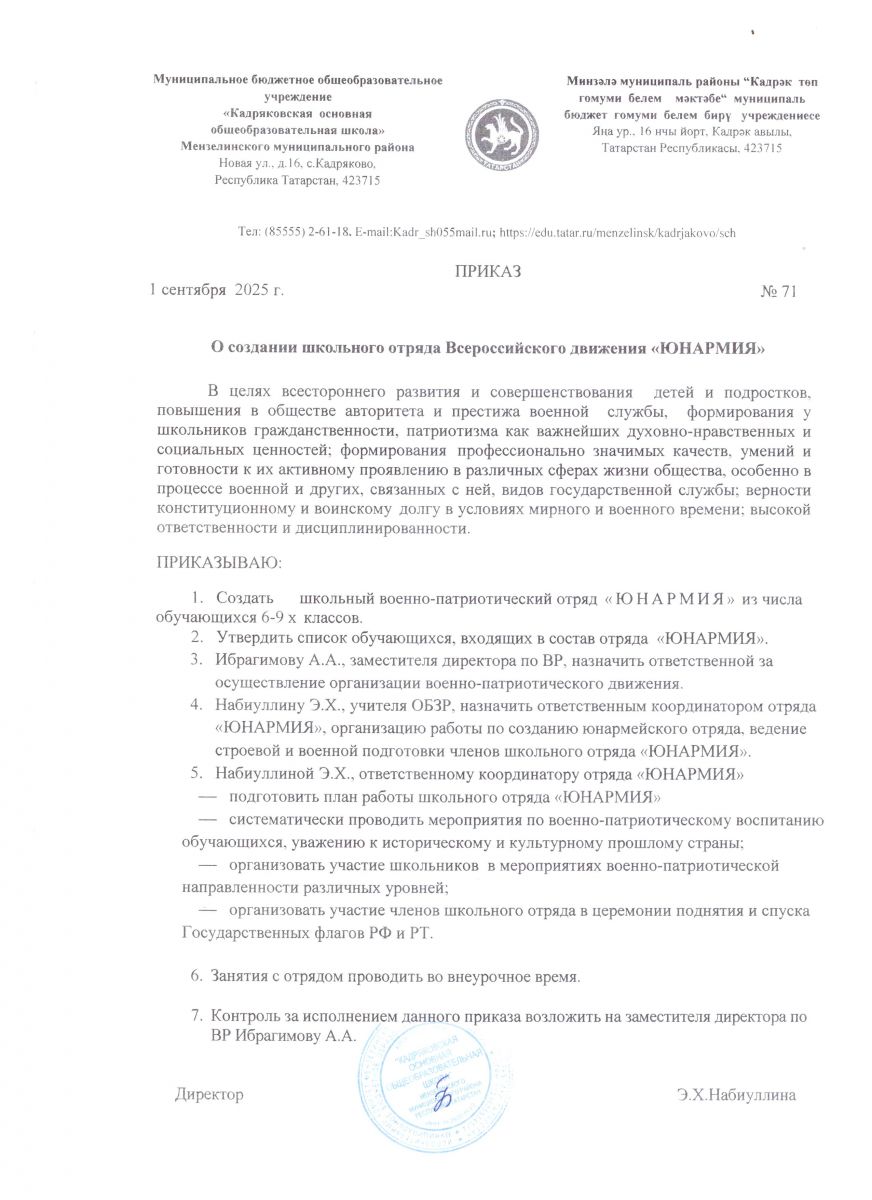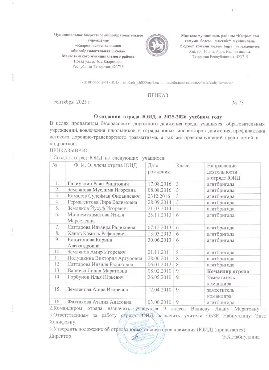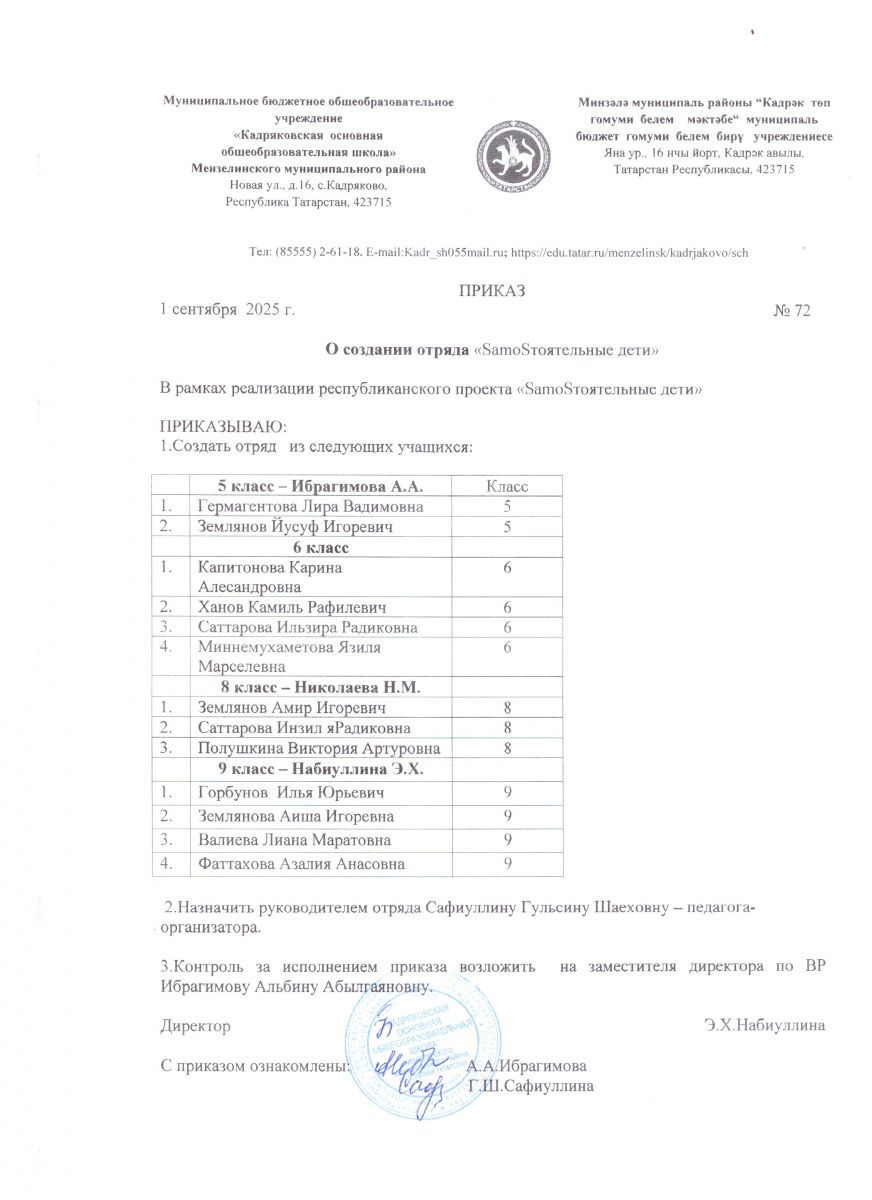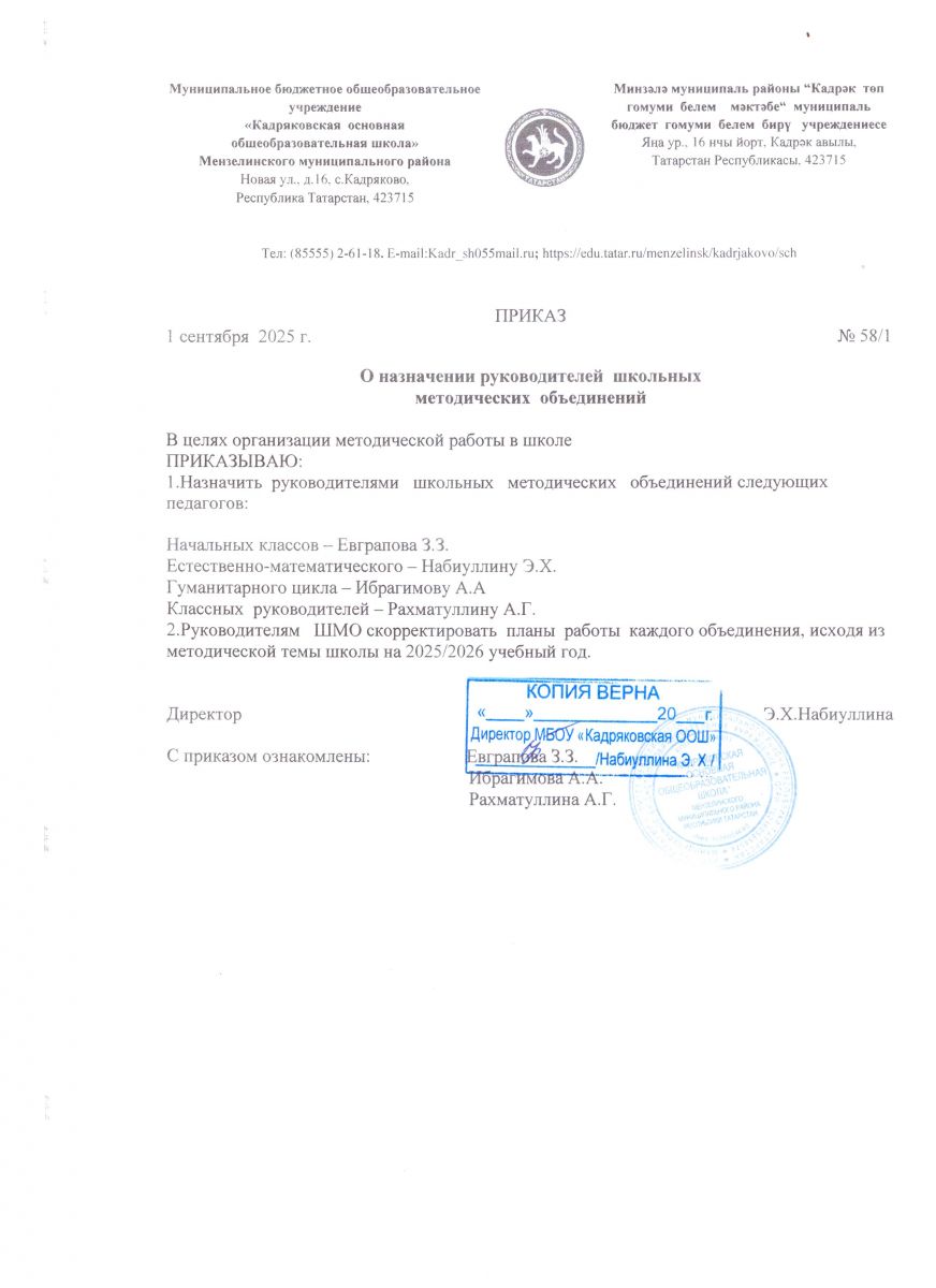 Муниципальное бюджетное общеобразовательное учреждение «Кадряковская основная общеобразовательная школа» Мензелинского муниципального района РТ/ Татарстан Республикасы Минзәлә муниципаль районы "Кадрәк төп гомуми белем мәктәбе" гомуми белем муниципаль бюджет учреждениесе