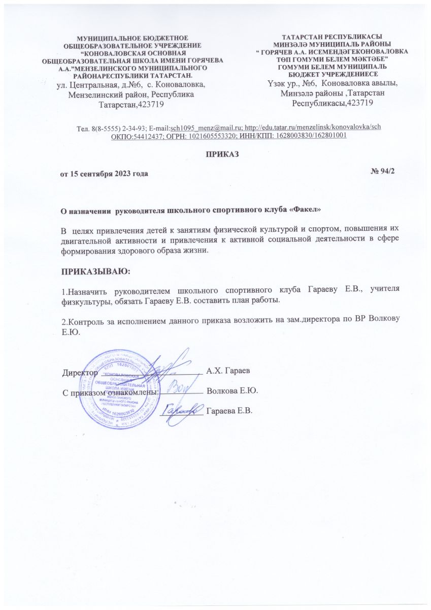 Приказ МБОУ "Коноваловская ООШ имнеи Горячева А.А." "О создании школьного спортивного клуба"