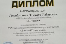 - 3 место на республиканском этапе конкурса "Дорога БЕЗ опасности" (лэпбук по ПДД, выполнила воспитатель Гарифуллина Э.З.),
