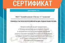 Учащиеся школы под руководством учителя татарского языка Биковой Г.Г., учителей начальных классов Гараевой Н.Г., Талиповой Р.М., Курбановой А.Р., учителя английского языка Шайдуллиной А.М. с 10 по 21 февраля 2020 года приняли участие во Всероссийской акции «Родные языки России», посвященной Международному дню родного языка. В школе организовали творческий вечер, где учащиеся продекламировали стихи на русском, татасрком и английском языках, также участники Акции записали на видео стихотворение на родном языке из числа языков народов Российской Федерации и опубликовали в социальных сетях с указанием хештега #РодныеЯзыкиРоссии. Всероссийская акция приурочена к Международному дню родного языка и направлена на популяризацию изучения родных языков народов Российской Федерации, которые являются национальным достоянием и историко-культурным наследием Российского государства.