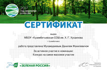 В рамках Года Экологии, за активное участи в акции "Субботник "Зеленая Россия-2017", коллектив школы отмечен Сертификатом от оргкомитета.