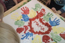 Вторая группа раннего возраста, с воспитателем Гульнарой Рафисовной, приготовили для своих мам букет из своих отпечатков ладошек вокруг сердца