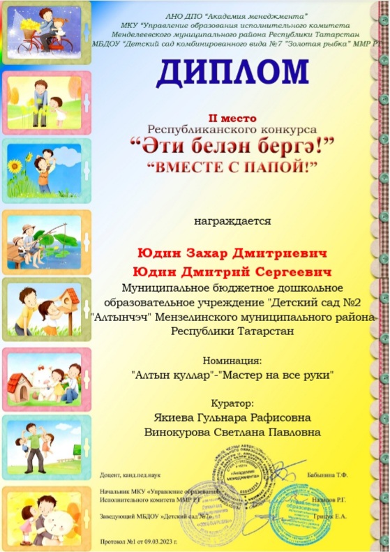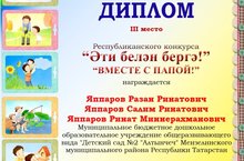 Поздравляем победителей республиканского конкурса «Әти белән бергә!» - «Вместе с папой!». Юдин Захар и Багауетдинов Дамир со своими папами заняли 2 место, Разан и Салим Яппаровы и Фахриев Данияр заняли 3 место. Выражаем огромную благодарность папам за участие в конкурсе. Молодцы!