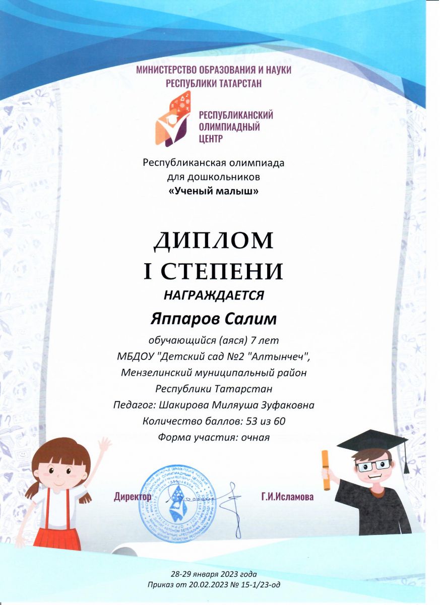 Поздравляем победителей республиканской одимпиады для дошкольников “Ученый малыш”. Мельников Самир, Яппаров Салим, Рязанова София, Кожевников Даниэль, Липин Егор заняли 1 место в своих возрастных группах и были награждены дипломими министерства образования и науки РТ. Молодцы!