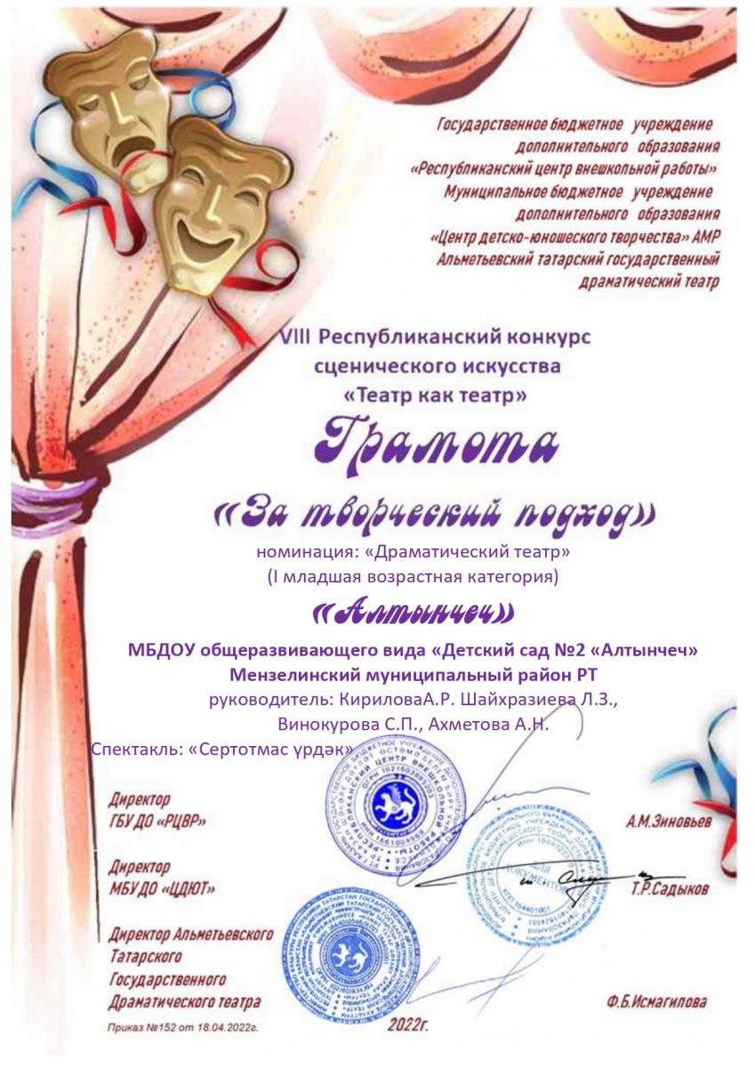 2 нче "Алтынчәч" балалар бакчасында тәрбияләнүче балалар "Театр как театр" VIII Республика сәхнә сәнгате конкурсында катнаштылар һәм "Иҗади якын килү өчен" грамотасы белән бүләкләнделәр.