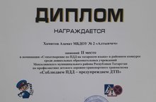 Воспитанник МБДОУ N2 "Алтынчэч" Хамитов Азамат участвовал в конкурсе "Соблюдаем ПДД- предупреждаем ДТП" и занял Il место в номинации "Стихотворение по ПДД на татарском языке". Ему вручили грамоту и подарок.