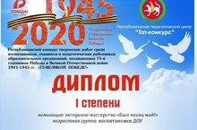 Воспитанница МБДОУ детского сада #2 "Алтынчеч" Шакирзянова Сагдия (воспитатель Якиева Г.Р.) приняла участие в республиканском конкурсе творческих работ, посвящённых 75 - й годовщине Победы в Великой Отечественной войне и стала победителем в номинации: актерское мастерство актерское мастерство "Был месяц май!"