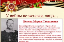 Классный час «У войны не женское лицо» ребятам рассказали о бессмертном подвиге женщин на войне. В ряды защитников Родины встали около 500 тысяч девушек, из них 200 тысяч комсомолок. 70% мобилизованных девушек служили в действующей армии. В славной летописи Великой Отечественной войны много женских имен, отмеченных боевыми наградами Родины. Двести тысяч награждены боевыми орденами, 90 стали Героями Советского Союза. ... Ребята послушали отрывки из книги Светланы Алексиевич «У войны не женское лицо», посмотрели отрывки документального кино. На мероприятии ребята еще раз вспомнили о том, что не всем было суждено прийти со страшной войны. Познакомились с историей жительнице нашего села Бокова Мария Степановна. Память о героях и рядовых всегда будет жить в наших сердцах.